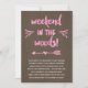 Dieses niedliche, RustikalChic Einladung für einen "glamping" Junggeselinnen-Abschied an einer Kabine kennzeichnet eine hübsche Bürstenskriptkalligraphie, die liest "Wochenende im Holz!" Der Entwurf umfaßt auch ein Herz und ein Pfeil, hübscher Schnörkel, rosa Glitter des Imitats und ein hölzerner Beschaffenheitshintergrund.