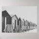 Ein ruhiges, schwarz-weißes Foto einer Reihe von Kabinen am Strand.