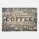 Kaffee schreibt wie macchiato, latte, cappucino, usw., die in einem themenorientierten Hintergrund des Schmutzes ganz aufgeführt sind. Ideal für den Kaffee besessen gewesen!