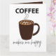 Kaffee macht mich glücklich Coffee Card Original Design von Nisha Prabhu. Für alle Kaffeeliebten da draußen ist diese Karte ein wenig Freude! Mit einem skurrilen Design, das das Wesen dieser perfekten Brühe einfängt, ist es der perfekte Weg, Ihre Liebe für Kaffee mit Freunden, Familienmitgliedern oder einer ganz besonderen Person zu teilen. Ob Geburtstag, Urlaub oder einfach nur, diese Karte wird jeden Tag aufheitern! Ideal für Kaffeeliebhaber und Freunde gleichermaßen! Bringen Sie jemandem ein Lächeln ins Gesicht und lass ihnen zu wissen, dass Kaffee das Leben wirklich etwas süßer macht. Ideal zum Gießen oder behalt an der Hand für jeden Anlass. Holen Sie sich noch heute und verbreiten Sie das Glück!