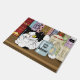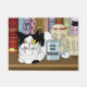 Schwarz-Weiß-Tuxedo-Katze weckte einfach auf einem Küchentisch oben mit seinen Katzenkochbüchern, Kaffee-Tasse, Zucker und Creme.