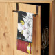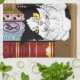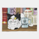 Schwarz-Weiß-Tuxedo-Katze weckte einfach auf einem Küchentisch oben mit seinen Katzenkochbüchern, Kaffee-Tasse, Zucker und Creme.