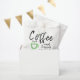 Weiße Geschenktütchen. Kaffee und Freunde sind die perfekte Mischung. Graue Lieben und eine grüne Kaffeetasse.