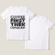 Beginnen Sie Ihren Tag mit diesem kühnen und doch einfachen T - Shirt-Design, das jeden Kaffeeliebhaber anspricht! Der T - Shirt "Coffee First, Then Conquer" ist mit einer sauberen, serifenlosen Typografie und einer glänzenden monochromen Farbpalette perfekt für diejenigen, die an den Tag mit Koffein und Selbstvertrauen glauben. Ideal für: Kaffeeliebhaber und Coffeinsüchtige. Bürobekleidung, lässig oder von Zuhause aus. Geschenke für Geburtstage, Ferien, oder "nur weil" Momente.