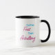 Kaffee zuerst, dann erwachsen. Punk gothische Alternative hübsche Frau in einem Mohawk mit rosa und blauen Akzenten und lustigen Kaffeekonzept.