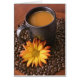 Kaffee mit Milch in einer schwarzen Tasse, umgeben von Kaffeebohnen und einer gelben Blume.