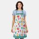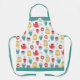 Diese niedliche Schürze zeichnet sich durch ein blaues, goldfarbenes, rosa und weißes Muster aus Tee- oder Kaffeeköpfen, Tassen, Honig und Marmelade sowie andere Boho-artige Küchenbilder aus. Oben und unten befindet sich ein passender aquamariner blauer Rahmen. Ihr Monogramm ist auf einem in Gold ausgekleideten Rundbanner aquamarin. Hübsch und personalisiert nur für sie!