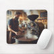 Ein nahes Händchen in einer abgetragenen Schürze, das eine Partie reichhaltiger, brauner Kaffeebohnen in eine Vintage Kaffeemaschine einfügt. Dampf oder Rauch steigt anmutig aus der Maschine und deutet auf den aromatischen Röstprozess im Inneren hin. Die industrielle und zugleich einladende Kulisse besticht durch eine rustikale Ziegelwand und eine warme Beleuchtung, die an ein gemütliches Café oder ein Bratwerk erinnert. Die mit Kaffee gefüllten Regale vervollständigen das authentische Café-Ambiente.