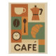 Das Plakat ist in ein modulares Raster unterteilt, das aus Quadraten und Rechtecken mit verschiedenen Proportionen besteht, die jeweils eine stilisierte Darstellung enthalten: eine Tasse, ein Kaffeematerial, eine italienische Kaffeemaschine, ein Löffel, eine Uhr, ein Halbmond. Jedes Element ist in einer einfachen, einfarbigen Silhouette im Piktogramm-Stil gezeichnet. Die Anordnung wirkt auf den Rhythmus und das Gleichgewicht der Formen wie ein Grafikspiel. Die Farben sind weich, aber bestimmt: Terracotta, Creme, Braune, Orange süß, Salbei. Das CAFÉ-Wort ist unten in einem speziellen Kästchen.