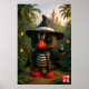 Dieses Bild zeigt einen charmanten, stilisierten Charakter, der einer Figur aus Yanbaru Kuina ähnelt, die als ein kleiner Vogel dargestellt ist, der als Zauberer oder Hexe verkleidet ist. Der Charakter hat einen dunkelgrauen Körper, große runde schwarze Augen, einen prominenten orangen Schnabel und Füße. Es trägt einen schwarzen Zauberhut mit einer weißen Band und ein schwarzes Gewand, das mit golden Halbmonden und Sternen geschmückt ist. In seiner links Hand hält er einen kleinen Besen und in der rechten Hand eine winzige Glasflasche, die eine dunkle lila Flüssigkeit enthält. Der Vogel hat auch ein gestreiftes Unterhemd. Der Hintergrund ist ein bezauberndes, tropisches Ambiente mit viel Grün und Palmen. In der Ferne kann man eine große Burg oder ein fantastisches Gebäude sehen, eingebettet in die Hügel, was zu einer magischen Atmosphäre beiträgt. Weiche, glühende Laternen werden zwischen den Bäumen aufgehängt und geben dem Bild ein warmes Licht. Der Gesamteindruck ist skurril und abenteuerlich.