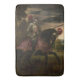 Dieses Design zeigt ein Gemälde des italienischen Malers der Renaissance Titian (1488-1576), der oft als das wichtigste Mitglied der Venezianischen Schule des 16. Jahrhunderts gilt. Es zeigt Kaiser Karl V., den Heiligen Römischen Kaiser, auf dem Pferd in der Schlacht von Mühlberg, die 1547 während des Schmalkaldischen Krieges stattfand. Die Kämpfe fanden in Mitteleuropa statt, in der Region des modernen Deutschlands. Charles V hält einen Lanze und trägt einen vollen Anzug Rüstung, einschließlich eines Helms, während er mit seinem schwarzen Pferd in den Kampf fährt. Das Pferd trägt einen eleganten roten Mantel aus opulenten Stoffen. Das ursprüngliche Kunstwerk wurde 1548 von Tizian gemalt und befindet sich heute im Prado Museum in Madrid, Spanien.