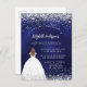 Eine moderne, stilvolle und glamouröse Einladung zu einer Quinceañera, 15. Geburtstagsfeier. Ein marineblauer Hintergrund mit Imitaten Glitzer, Glitzern, ein Mädchen mit einem Kugelkrug. Die blaue Farbe ist ungleichmäßig. Der Name ist mit einem modernen handgeschriebenen Stilskript geschrieben. Personalisieren Sie Ihre Party-Daten und fügen Sie sie hinzu.