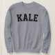 Das ist der beliebte Langarm-Pullover von Kale mit dem Wort kale in schwarz auf einem grauen Sweatshirt gedruckt.