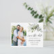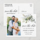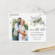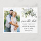Moderne Kalligrafie Script Elegant Watercolor Botanische Grüne Hochzeitsszenarien Verlobung Announcement Foto Save the Date Postcard beinhaltet Eukalyptus-Blätter, grünes botanisches Blattwerk, staubblaue Blätter und andere schöne botanische Vegetation.
