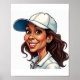 Cartoon von Kamala Harris in Sportbekleidung und einem weißen Hut