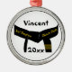 Das einzigartige Martial Arts Third Degree Black Belt Round Ornament kann personalisiert und datiert werden mit dem Namen Ihres Kampfkünstlers und in diesem Jahr zu gratulieren und zu gedenken, ein 3. Dan Blackbelt Werbeaktion Test oder Prüfung in Karate, taekwondo, kung fu, judo oder ju jitsu. Dieses typische Weihnachtsschmuck für Sportarten zeichnet sich durch ein digital erweitertes Foto eines schwarzen Kampfkunstgürtels aus, das in einem Knoten mit drei Goldbarren befestigt ist.