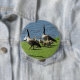 Dieses KnopfAusrüstungsbeschreibungen ein Foto einiger Kanada-Gänse, einschließlich zwei erwachsene Vögel und einige Gänschen. Sie sind auf grünem Gras nahe dem Ufer durch etwas blaugraues Wasser stehend.