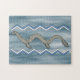 Blaue und weiße Zickzack-Designs erscheinen oberhalb und unterhalb eines serpentinen, schaf-köpfigen kanadischen Seemannsmonsters in diesem originalen kryptischen Kunstwerk von Richard H. Fay.