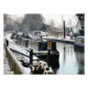 Winter auf dem Kanal. Die im Vereinigten Königreich als Schmalboote bekannten Kanalboote wurden ursprünglich zur Beförderung von Gütern im ganzen Land eingesetzt. Sie werden heute hauptsächlich zur Freizeitgestaltung genutzt und ziehen Menschen aus aller Welt an, um unsere ländliche Umgebung zu genießen. Diese Boote sehen sehr hübsch mit ihren hellen Kabinen aus, die traditionell blau, rot oder grün sind. Blume und Schlossdesigns schmücken auch die traditionelleren Boote..com.