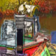 Ein Kunstdesign eines Schmalschiffkamins und einer alten, dekorierten Lampe.Die in Großbritannien als Schmalboote bekannten Canal Boote wurden ursprünglich für den Transport von Waren im ganzen Land verwendet. Sie werden heute hauptsächlich zur Freizeitgestaltung genutzt und ziehen Menschen aus aller Welt an, um unsere ländliche Umgebung zu genießen. Diese Boote sehen sehr hübsch mit ihren hellen Kabinen aus, die traditionell blau, rot oder grün sind. Blume und Schlossdesigns schmücken auch die traditionelleren Boote.
