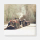 Winter auf dem Kanal. Die im Vereinigten Königreich als Schmalboote bekannten Kanalboote wurden ursprünglich zur Beförderung von Gütern im ganzen Land eingesetzt. Sie werden heute hauptsächlich zur Freizeitgestaltung genutzt und ziehen Menschen aus aller Welt an, um unsere ländliche Umgebung zu genießen. Diese Boote sehen sehr hübsch mit ihren hellen Kabinen aus, die traditionell blau, rot oder grün sind. Blume und Schlossdesigns schmücken auch die traditionelleren Boote.
