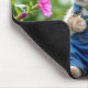 Ein niedlicher, in blauen Leuchten gekleideter Hase ist umgeben von lebhaften rosa Petunia-Blume und schafft so eine charmante und charmante Szene