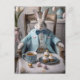 Kaninchen in blauem Mantel mit Nachmittagstee