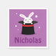 Papierserviette mit einem kleinen weißen Kaninchen in einem Zauberhut. Rund um sind Sterne und ein Zauberstab. Anpassbarer Name.