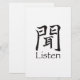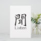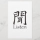 Das japanische Kanji-Symbol für das Wort "Hören" wird in kalligraphischen Pinselstrichen gezeigt und sieht sehr cool auf einem Hemd, einer Tasche, einer Kappe oder einem Knopf aus. Wir haben sogar die englische Übersetzung hinzugefügt, sodass die Leute die Nachricht bekommen. Das Design für das Zeichen basiert auf einem Gateway mit einem Ohr im Inneren. Hübsch cool! Sie können die Hintergrundfarbe ändern und auch Text hinzufügen.