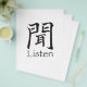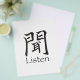 Das japanische Kanji-Symbol für das Wort "Hören" wird in kalligraphischen Pinselstrichen gezeigt und sieht sehr cool auf einem Hemd, einer Tasche, einer Kappe oder einem Knopf aus. Wir haben sogar die englische Übersetzung hinzugefügt, sodass die Leute die Nachricht bekommen. Das Design für das Zeichen basiert auf einem Gateway mit einem Ohr im Inneren. Hübsch cool! Sie können die Hintergrundfarbe ändern und auch Text hinzufügen.