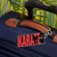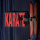 Das Wort Karate in Rot mit einem Kampfkünstler in einer Kick-Silhouette.