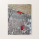 Ein Kardinal im Flug, während der andere sitzt und darüber nachdenkt, was zu tun ist.