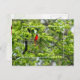 Dieser brillante rote männliche Kardinal hebt sich von hellgrünem Blattwerk ab.