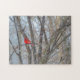 Ein männlicher Kardinal und eine schwarz gekappte Chickadee sitzen während eines Schneesturms in meinem Rotblütenbaum.