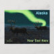 Zwei verfeinerte Bullkaribu (Rangifer tarandus), auch Rentiere genannt, wandern nachts durch die Tundra, während sie für den Winter nach Süden ziehen. Frost ist auf dem Boden und die Nordlichter leuchten über weit entfernten Bergen. Text liest "Alaska" erscheint in leuchtend blau und weiß Fügen Sie Ihren eigenen Text.