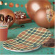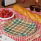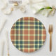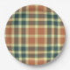 Reizender karierter PapierTeller mit Herbstfarben. Die Farben, die verwendet werden, um den karierten Entwurf zu machen, sind orange, grün und Gelb.