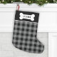 Weihnachts-Strumpf bietet ein personalisiertes Design für Ihren Haushund mit einem grauen und schwarzen Büffel-karierten Karo-Muster und einem eigenen Monogramm-Namenstext in schwarz auf einem weißen Knochenschild. Enthält das gleiche Design auf beiden Seiten des Strumpfs.