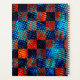 Dunkelblaue, knusprige, karierte und hellblaue Streifen und orangefarbene Streifen mit rötlich motierten Farbtönen und dunklen Kanten, die die Wahrnehmung von schmutzig oder gesprenkelt.