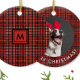 Dieses stilvolle Keramik-Ornament besticht durch ein klassisches kariertes schottisches Tartan-Muster mit rotem und schwarzem geometrischem Druck und einem einfachen, anpassbaren Monogramm. Auf der anderen Seite hat es ein niedliches, austauschbares Foto und einen anpassbaren Text. Sie können das Foto durch Ihr eigenes ersetzen, oder sogar durch Ihr Firmenlogo.