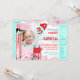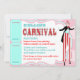 Fun-Karneval Thema Geburtstagskarte Einladung mit Pfahlwandler, Baumwolle Süßigkeiten, Ballons in Rosa, Aqua, Rot und Weiß.