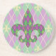 Ein harlequin-Muster von grün und lila verwandelt sich in eine spielerische Raute mit einem Overlay aus goldenen Diamantdächern und Lilie und schafft so ein lustiges und farbenfrohes Muster, das perfekt für alle New Orleans beeinflussten Mardi Gras Feste geeignet ist. Das Muster wird hinter der Silhouette einer Lilie maskiert, um eine lustige letzte Note hinzuzufügen.