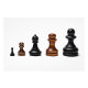 Eine Reihe von fünf Schachfiguren verschiedener Größen, von den kleinsten bis zu den links bis zu den größten rechts, als Symbol für das berufliche Wachstum. Abgeschieden vor weißem Hintergrund.