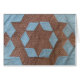 Quilt Block in braunem und blauem "Schloss" Muster. Die zentrale Burg ist eine braune Sternform, umgeben von der "6-seitigen Mauer" mit den "Uhrentürmen", die sich von der Mitte der Wände ausbreiten. Inside text liest "Warm gedacht für Sie" in einem "Stich" Schriftart (Mai personalisiert sein).