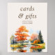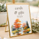 Fall Lake Schild für Ihre Karten & Geschenke Tisch bei Ihrer Hochzeit oder Brautparty. Rustikales Land, landschaftliches Aquarelldesign mit Seeblick mit bewaldeter Parklandschaft mit Grün und schönen Bäumen mit Herbstblättern. Einfach mit Ihren persönlichen Wünschen und Namen zu personalisieren. Wenn Sie gewollt haben, die Hintergrundfarbe zu ändern, klicken Sie auf, um das Design-Tool anzupassen. Wenn Sie passende Produkte wünschen, schauen Sie bitte in meine Herbstsee-Kollektion.