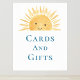Diese Karten und Geschenke Baby Dusche Schild mit einem gelben Aquarell lächelnd Sonne und blauen Typografie. Original Wasserfarbe © Michele Davies.