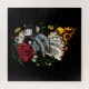 Original Vektorkunst einer Hand, die Karten hält, die in Brand sind. Mit Goldmünzen, Würfeln, 8 Ball, Ribbon und einer Rose.