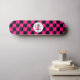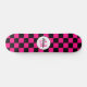 Checked Quadrate heißen rosa schwarzen Retro Monogram Skateboard. Personalisieren Sie Sportgeräte mit Ihrem persönlichen Initial und Namen. Cooles, hintergrundgezogenes geometrisches Quadratmuster. Vintage Fliesen schwarz und heiß rosa modernes Schachbrett.