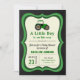 Erleben Sie die coole Traktor-Babydusche mit einem niedlichen grünen Bauerntraktor mit moderner Typografie auf einem Kalkbrett. Fügen Sie einfach Ihre Veranstaltungsdetails zu dieser einfach zu bedienenden Vorlage hinzu, um sie zu einer einmaligen Einladung zu machen. Dreh die Karte auf, um eine schöne grüne Grasstruktur auf der Kartenrückseite zu zeigen.