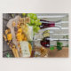 Dieses schmackhafte Design umfasst Wein, Käse, Cracker, Walnüsse, Honig und Trauben.