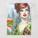 Eine Frau in einem Sasquatch Print-Shirt hält einen Cheeseburger im Wald AI generierte Kunst